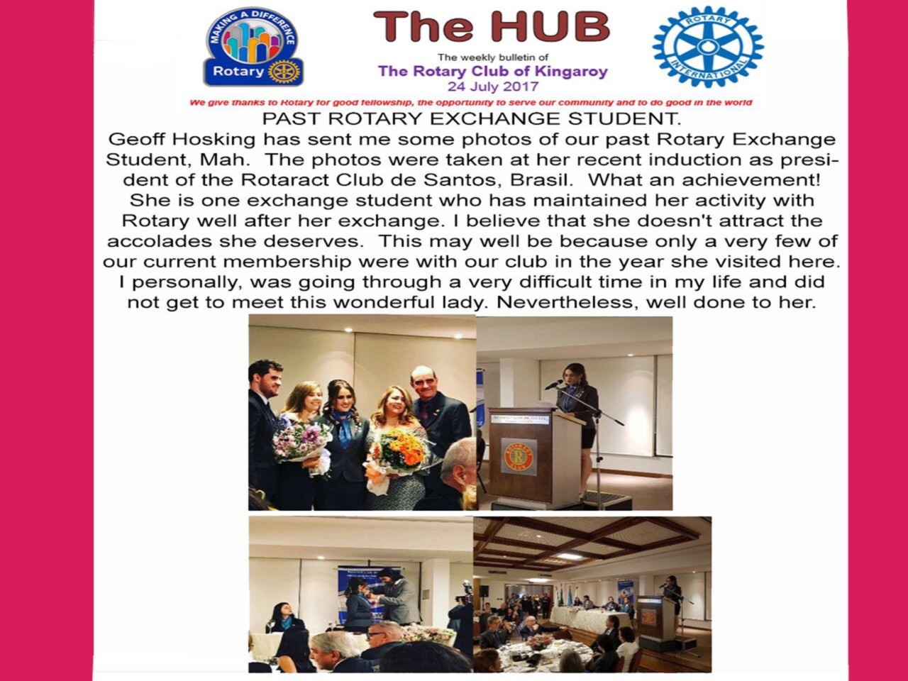 Muito obrigada ao Rotary Club of Kingaroy, pelo carinho com nossa presidente e pela agradável surpresa de nos colocar em seu informativo
